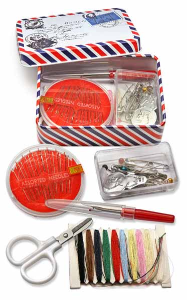 Det här lilla sykitet i plåtask har allt du behöver för att fästa dina tygmärken på ovven eller fracken.